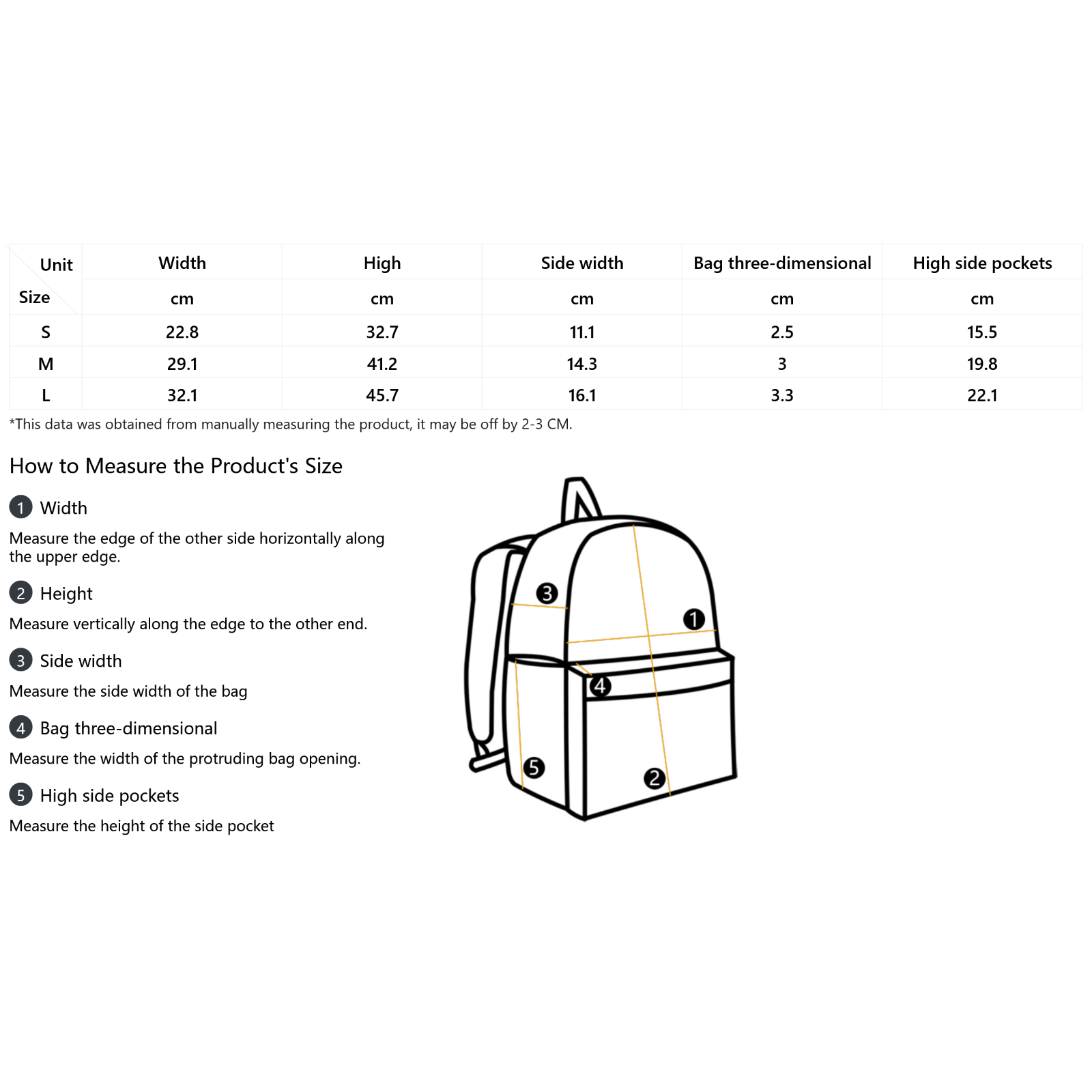 | Size | Width | High | Side width | Bag three-dimensional | High side pockets |